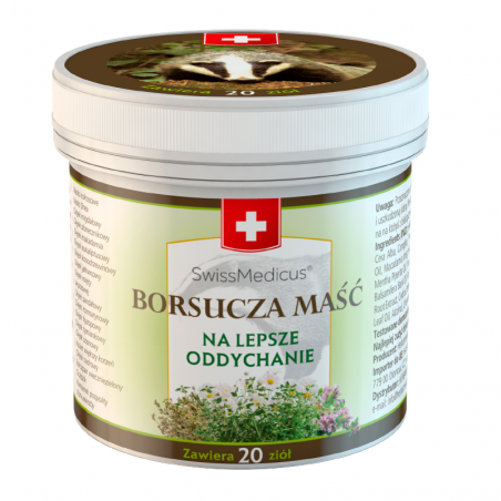 Borsucza maść SwissMedicus to unikalny preparat roślinny, który skutecznie zastępuje działanie tradycyjnego borsuczego tłuszczu, który od pokoleń stosowany był jako balsam na klatkę piersiową dla lepszego odkrztuszania przy grypie i przeziębieniu. Maść ta powstała z harmonijnej mieszanki 20 naturalnych ekstraktów ziołowych zawartych w maśle kokosowym BIO, dzięki czemu stanowi bezpieczną i skuteczną alternatywę dla tradycyjnych środków.